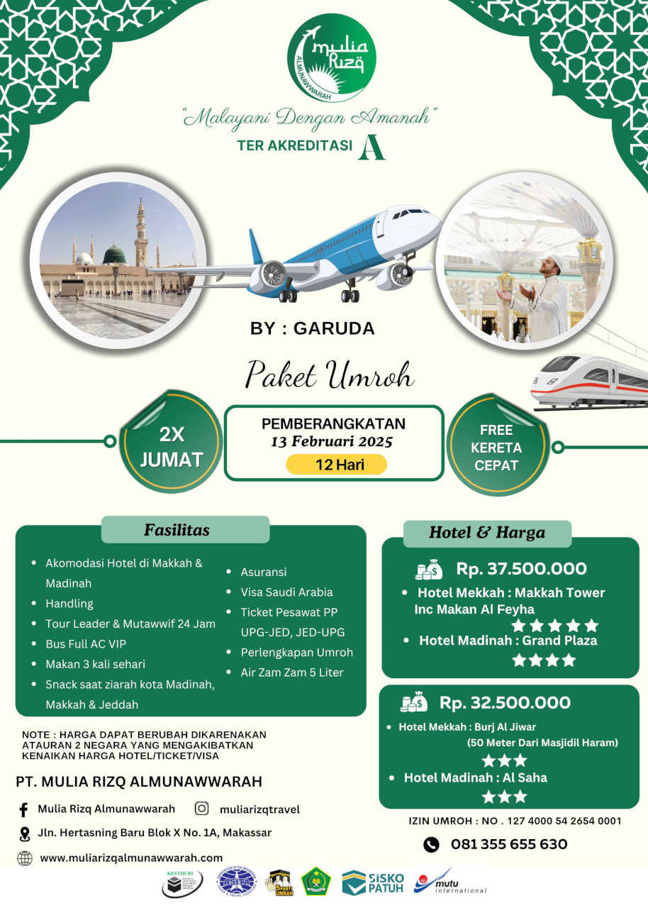 Masjid Besar Sheik Zayed - Abu Dhabi Hubungi Kami Mulia Rizq Travel Mulia Rizq AlMunawwarah berfokus pada keunggulan layanan dalam memenuhi kebutuhan jamaah, dengan berkomitmen untuk melayani visa, jasa perjalanan umroh, serta semua layanan pendukung secara prima. TOUR HAJI UMRAH Reservasi Online Nama Alamat Email Telepon Pilih Jadwal Pilih Paket Pilih-- Umrah April (Syawal) 2025 Umrah Februari 2025 Umrah Januari 2025 Umrah Desember 2024 Umrah November 2024 Umrah Reguler 2024 Umrah Bronze 2024 Umrah Sliver 2024 Permintaan Khusus kirim
